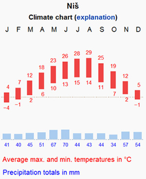 The climate of the Niš area is moderate continental, with an average yearly temperature of 11.2 °C. July is the warmest month of the year (with the average of 21.2 °C) and January is the coldest month (with the average of 0.2 °C). The average of the annual rainfall is 567.25 mm, while the average barometer value is 992.74 mb. There are 123 days with rain and 43 days with snow. On the average, the wind force is just below 3 Beaufort. April is a month in spring with variable weather conditions that can result in sunny periods and occasional showers. Temperature will probably vary in the range from 5 to 20 degrees.